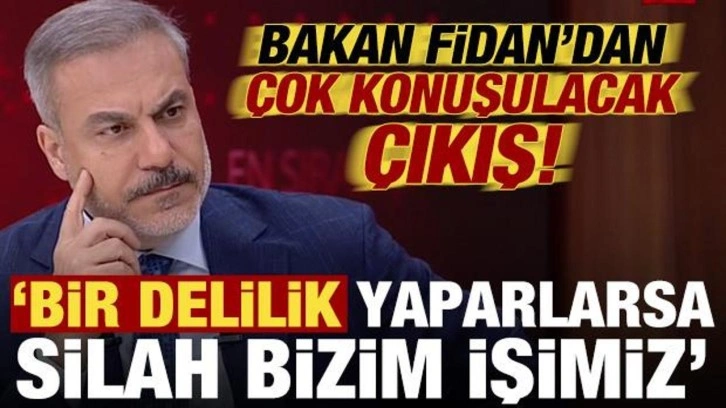"Güney Kıbrıs'ta pişirilmek istenen şey baştan sona radarımızda' diyen Dışişleri Bakanı Hakan Fidan, program sunucusu Turgay Güler'in "Bir delilik yaparlarsa ne olur?" sorusu üzerine "Ben bunu söylemek istemiyorum, silah bizim işimiz. Bunlar hiçbir zaman için savaşmış değil. Bu konuları akıllarından bile geçirmemeleri gerekiyor" dedi.