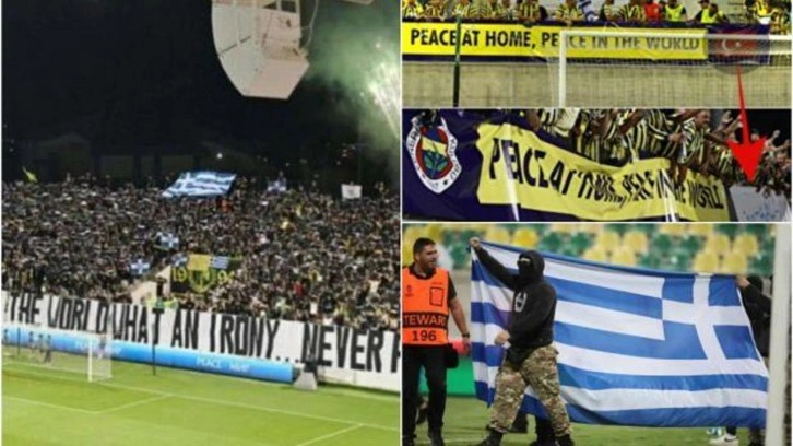 Fenerbahçe taraftarları, AEK Larnaca maçı öncesi Mustafa Kemal Atatürk’ün ‘Yurtta sulh, cihanda sulh’ sözünün İngilizcesini (Peace at home, peace in the world) pankart olarak açtı.