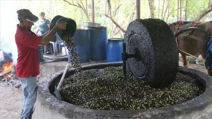 Dalından toplanan zeytinler, asırlık taş değirmenin altına yerleştiriliyor. At gücüyle çevrilen değirmende ezilen zeytinler, bir süre fıçılarda bekletiliyor. Sonrasında ılık suda yıkanan tanelerin yüzeye çıkan yağı süzülüp şişeleniyor.
