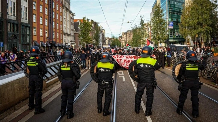Amsterdam Merkez İstasyonu yakınlarında toplanmalarının istendiği Filistinli göstericilerin başka bir alana gitmek istememesi üzerine polis müdahalede bulundu.