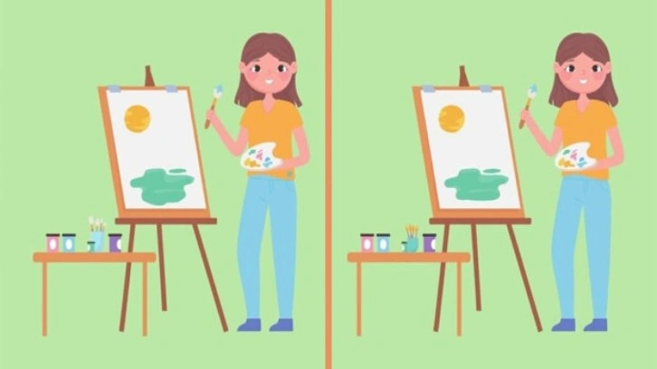 Yukarıdaki resimde resim yapan bir kadın ve yanında kullandığı malzemelerin olduğu bir sehpa görüyorsunuz. İlk bakışta iki resim neredeyse birbirinin aynısı ama biraz daha yakından baktığınızda bazı ufak farklılıklar olduğunu fark edeceksiniz.
