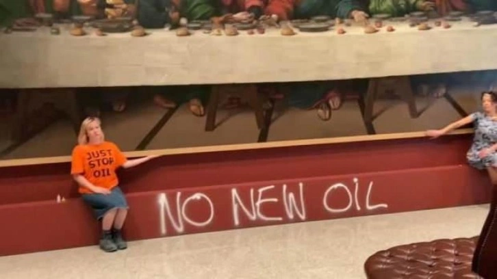 İngiltere hükümetinin yeni fosil yakıt ruhsatlandırma ve üretimini durdurmayı taahhüt etmesini sağlamak amacıyla kurulan iklim aktivisti grup Just Stop Oil, tarihi sanat eserlerini hedef aldığı eylemlerine devam ediyor. İngiltere’nin başkenti Londra’da bulunan Kraliyet Akademisi’ne gelen 5 iklim aktivisti, ellerini sürdükleri yapıştırıcı ile Leonardo Da Vinci'nin öğrencisi Giampietrino tarafından 1520'lerde yapıldığına inanılan Da Vinci’nin “Son Akşam Yemeği” adlı eserinin bir kopyası olan tablonun çerçevesine yapıştırdı. Eylemcilerden biri ise, tablonun altına sprey yardımıyla “No New Oil” (Daha Fazla Petrole Hayır) yazdı.