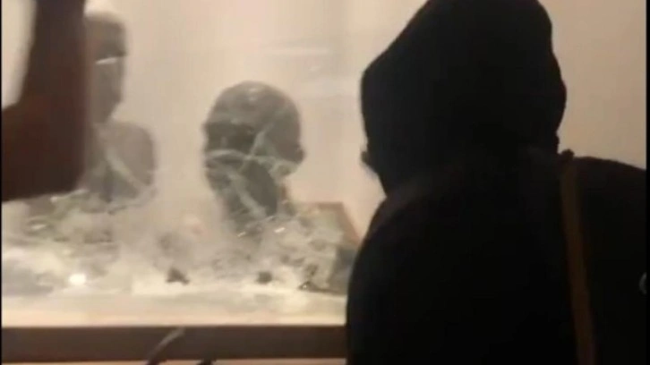 Eyleme ilişkin sosyal medyada paylaşılan görüntülerde, iki eylemcinin heykellerin sergilendiği cam muhafazayı kırıp büstleri götürdüğü yer aldı.