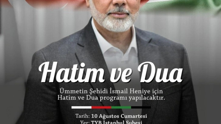 Türkiye Yazarlar Birliği, (TYB), İşgalci İsrail'in hain suikasti sonucu şehit olan Hamas Siyasi Lideri İsmail Haniye için 'Hatim ve Dua' programı düzenleyecek.