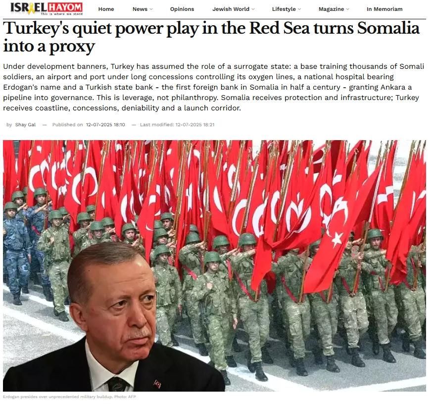 Savaş suçlusu Başbakan Netanyahu'nun hükümetine yakınlığıyla bilinen Israel Hayom gazetesinde yayınlanan bir analizde, Türkiye'nin Kızıldeniz'deki sessiz güç oyunlarıyla Somali'yi bir "vekil devlete" dönüştürdüğü öne sürüldü. Analist Shay Gal imzalı yazıda, Ankara'nın bu hamlesinin bölgedeki tüm stratejik dengeleri altüst etme potansiyeli taşıdığı vurgulandı.