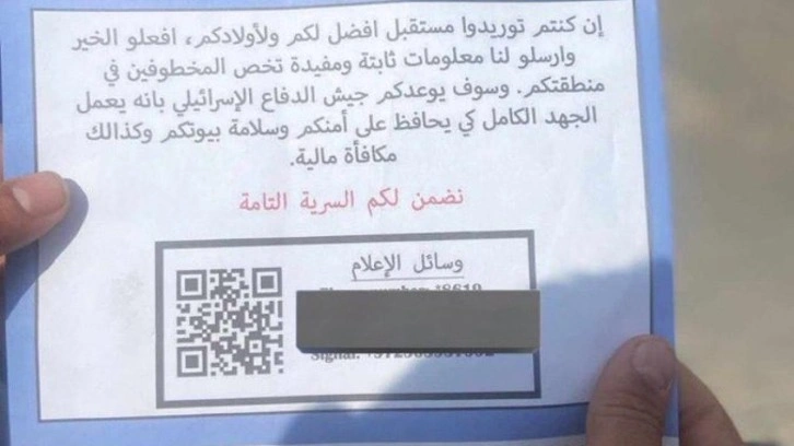 Notlarda " Kendiniz ve çocuklarınız için daha iyi bir gelecek istiyorsanız iyilik yapın ve bize bölgenizdeki kaçırılanlarla ilgili yararlı bilgileri gönderin. IDF sizin güvenliğinizi ve evlerinizin güvenliğini sağlamak için her türlü çabayı gösterecektir. " ifadeleri yer aldı.