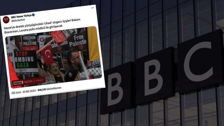 Londra'da düzenlenen Gazze'ye destek yürüyüşünü "Gazze'ye destek yürüyüşündeki 'cihat' sloganı: İçişleri Bakanı Braverman, Londra polis müdürü ile görüşecek" başlığıyla haberleştiren BBC, söz konusu haberinde elinde Türk bayrağı olan bir kadının fotoğrafına yer verdi.