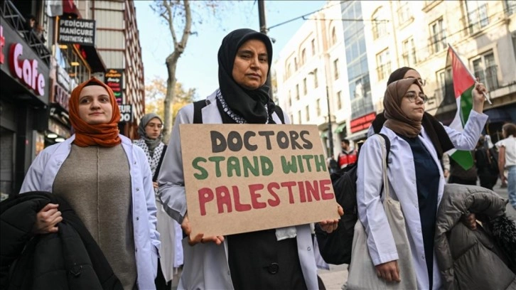 Burada, grup adına basın açıklamasını okuyan doktor Murat Can Çelik, 7 Ekim'de başlayan saldırıların artık şiddetlenen çatışmalarla birlikte katliama dönüştüğünü söyledi.