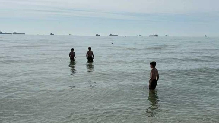 Menekşe Plajı'nda güneşli havanın tadını çıkaran bazı vatandaşlar, banklarda oturup kumsalda yürüdü, bazıları da denize girdi.