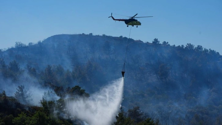 İzmir'in Seferihisar ilçesinde ormanlık alandaki yangına ekipler karadan ve havadan müdahaleyi sürdürüyor.