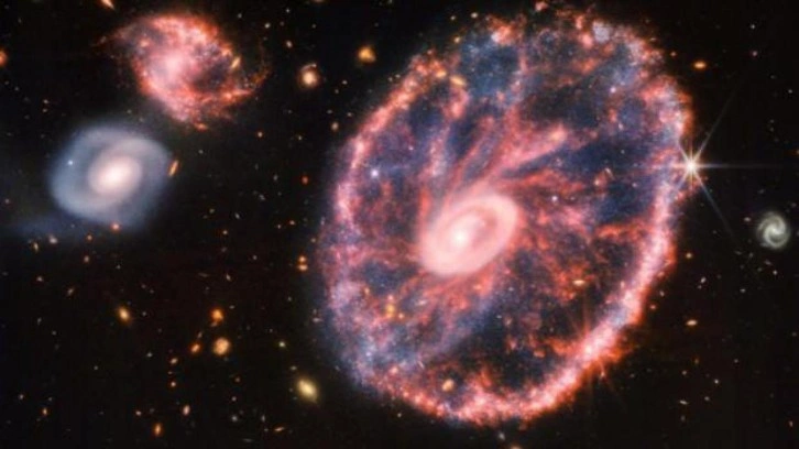 ABD Ulusal Havacılık ve Uzay Dairesi (NASA) ve Avrupa Uzay Ajansı (ESA), James Webb Uzay Teleskobu'ndan elde edilen en son görüntüleri yayınladı. James Webb Teleskobu’nun Cartwheel adlı galaksinin görüntüleriyle beraber galaksinin yıldız oluşumu ve merkezi kara deliği hakkında yeni ayrıntılar ortaya çıkardığı belirtildi. Sculptor takımyıldızında yer alan ve Dünya'dan yaklaşık 500 milyon ışık yılı uzaklıkta bulunduğu ifade edilen Chartwheel Galaksisi’nin bir araba tekerleğine benzeyen görünümünün biri sarmal diğeri daha küçük iki galaksinin yüksek hızlı çarpışması şeklinde oluştuğu aktarıldı.