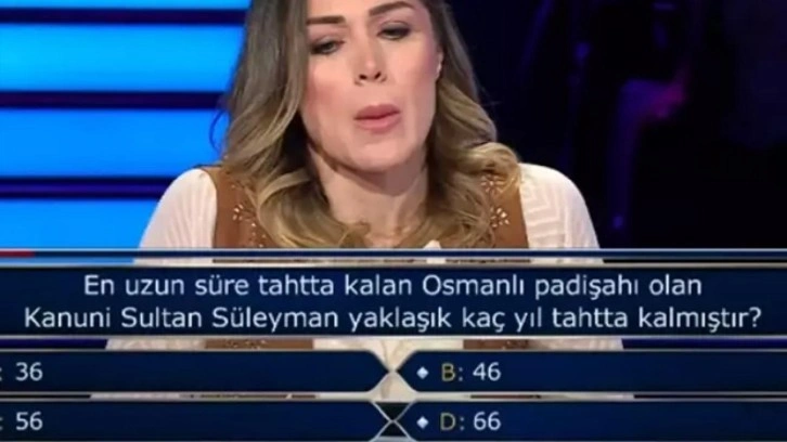 Ekranların sevilen bilgi yarışması Kim Milyoner Olmak İster? programında sorulan bir soru, vatandaşlar tarafından araştırılıyor. 'En uzun süre tahtta kalan Osmanlı padişahı olan Kanuni Sultan Süleyman yaklaşık kaç yıl tahtta kalmıştır?' sorusunun cevabını merak eden vatandaşlar, ikiye bölünmüş durumda. Peki doğru cevap nedir? Kanuni Sultan Süleyman kaç yıl tahtta kaldı?