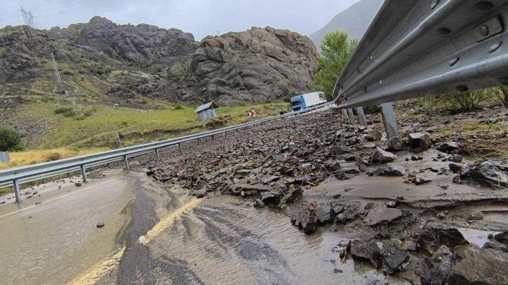 Gerçekleşen heyelanda yol, yamaçtan kayan toprak ve kaya parçalarıyla kapandı.