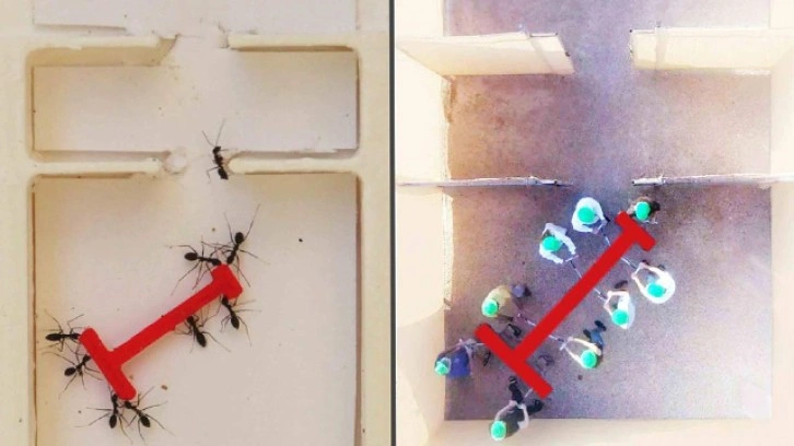 Ulusal Bilimler Akademisi Bildirileri'nde (PNAS) yayınlanan ve Weizmann Bilim Enstitüsü'ndeki Prof. Ofer Feinerman öncülüğünde yürütülen araştırma ilginç bir sonuç ortaya koydu. Feinerman ve ekibi şu soruyla yola çıktılar: Büyük bir yükü kolektif iş birliği içinde bir labirentte manevra etmede kim daha başarılı olacak? Böylece insanlar ve karıncalar için iki ayrı deney düzeneği hazırlandı.