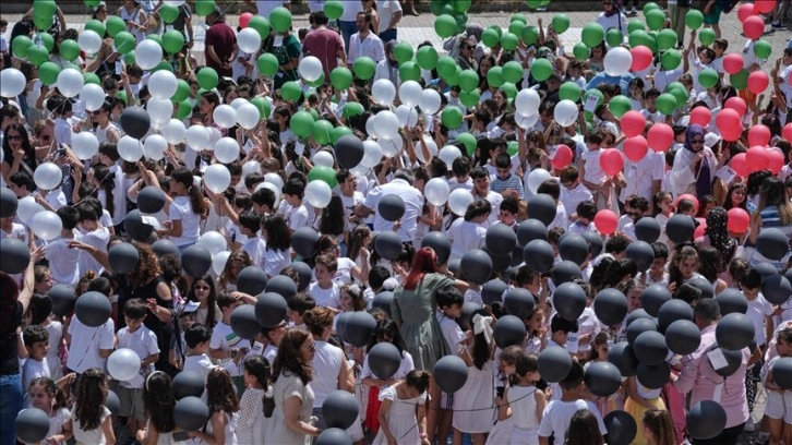 Bakırköy'de ilkokul öğrencilerinin karne töreninde, İsrail saldırılarında hayatını kaybeden Gazzeli çocuklar için hazırlanan temsili karneler, 800 uçan balonla gökyüzüne bırakıldı.