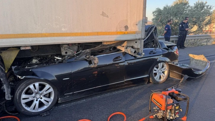 Çarpmanın etkisiyle tırın altına sıkışan otomobil, itfaiyenin çalışmasıyla bulunduğu yerden çıkarıldı.