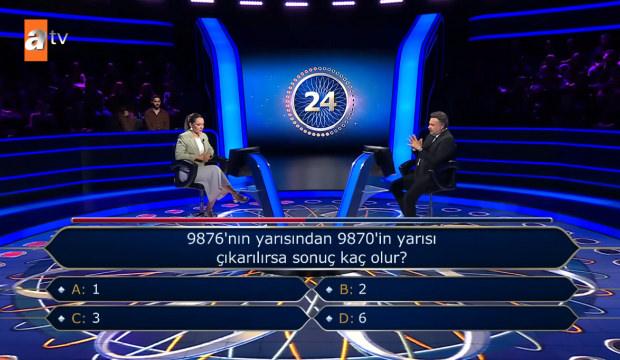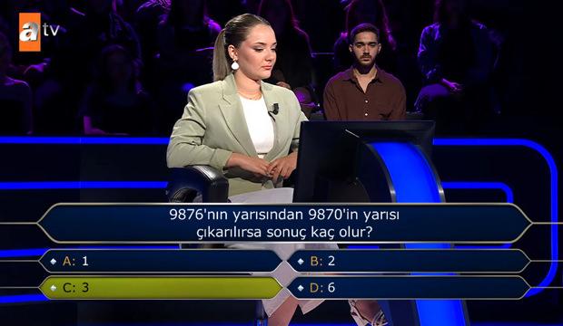 İŞTE O SORUDördüncü soruda yarışmacıya "9876'nın yarısından 9870'in yarısı çıkarılırsa sonuç kaç olur?" sorusu soruldu.