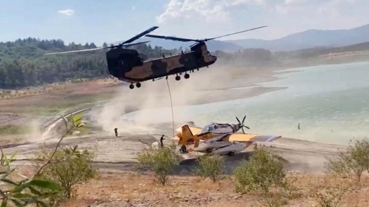 Hava Kuvvetleri Komutanlığı'na bağlı askeri helikopter, uçağı taşımak amacıyla göle geldi. Önce uçağın yakınındaki bir alana iniş yapan çift pervaneli helikopter daha sonra havalanıp uçağın bulunduğu noktaya yaklaştı.