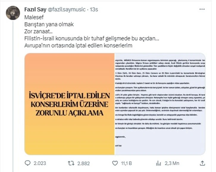 İfade özgürlüğünün merkezi olarak lanse edilen Batılı ülkeler, İsrial'in Filistin'de gerçekleştirdiği katliamlara karşı çıkan paylaşım yapanlara yönelik akıl almaz gir baskı uyguluyor. Dünyaca ünlü piyanist Fazıl Say'ın, Filistin'deki insanlık dramına sessiz kalmama