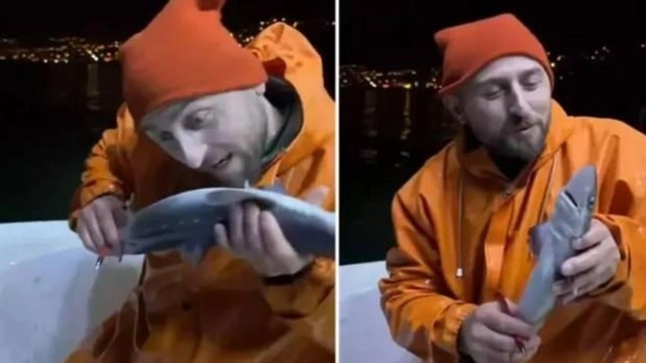 Karadenizli bir balıkçının yakaladığı köpek balığıyla olan ilginç anları sosyal medyada gündem oldu. Balıkçı, denizden çıkardığı köpek balığını önce gıdıkladı, ardından öperek yeniden denize bıraktı.