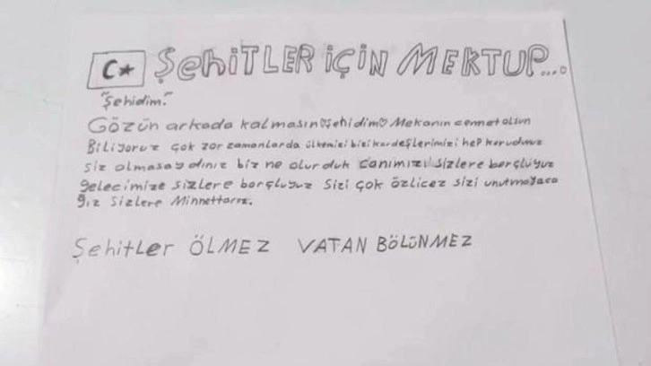 2'nci sınıf öğrencisi bir kız çocuğu ise asker olmak istediğini belirterek, Mehmetçik ağabeylerine selamlarını iletti. Bir başka çocuk da "Siz bizim için çok değerlisiniz. Bizler için gözünüzü kırpmadan hayatınızı feda ediyorsunuz. Siz bizim gururumuzsunuz" kelimelerini kağıda döktü.