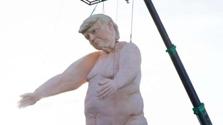 Gizemli sanatçı, 13 metre uzunluğunda ve 2 ton ağırlığında çıplak Donald Trump heykeli yaptı.
