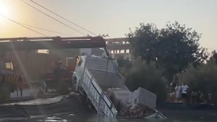 Kontrolden çıkan kamyon, yol kenarındaki sulama havuzuna düşerek suya gömüldü. Olayda yaralanan olmazken, kamyon vinç yardımıyla içi su dolu havuzdan çıkarıldı.