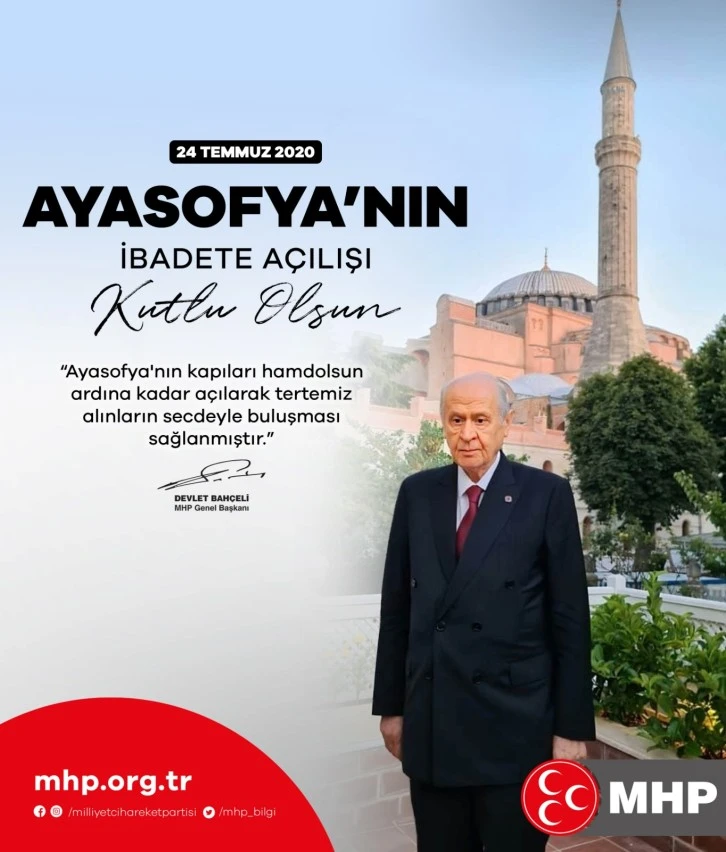 MHP Genel Başkanı Devlet Bahçeli; X üzerinden yapmış olduğu Ayasofya Mesajı