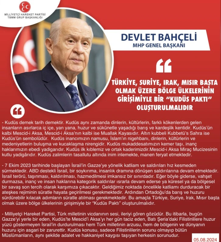 - Milliyetçi Hareket Partisi, Türk milletinin vicdanının sesi, ileriyi gören gözüdür. Bu itibarla, bugün Gazze'yi yerle bir eden, Kudüs'te Mescid'i Aksa'yı her gün taciz eden, Batı Şeria'daki Filistinlilere huzur yüzü göstermeyen İsrail'in durdurulması hem Türk milletinin arzusu, hem de bölgenin ve dünyanın huzuru için asgari bir zarurettir. Kudüs konusu, sadece Filistinlilerin sorunu olmayıp bütün Müslümanların, aynı şekilde adalet ve hakkaniyet kaygısı taşıyan herkesin sorunudur.