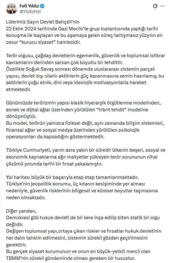 Milliyetçi Hareket Partisi (MHP) Genel Başkan Yardımcısı Feti Yıldız, sosyal medya hesabından yaptığı açıklamada, "Liderimiz Sayın Devlet Bahçeli'nin 22 Ekim 2024 tarihinde Gazi Meclis'te grup toplantısında yaptığı tarihi konuşmayla başlayan ve bu aşamaya gelen süreç, tartışmasız yüzyılın en cesur kurucu siyaset hamlesidir. Terör olgusu, çağdaş devletlerin egemenlik, güvenlik ve toplumsal istikrar kavramlarını derinden sarsan çok boyutlu bir tehdittir. Özellikle soğuk savaş sonrası dönemde uluslararası sistemin parçalı yapısı, devlet dışı silahlı aktörlerin güç kazanmasına zemin hazırlamış; bu aktörlerin çoğu etnik, dini veya ideolojik motivasyonlarla hareket etmektedir. Günümüzde terörizmin yapısı klasik hiyerarşik örgütlenme modelinden, esnek ve dijital ağlar üzerinden yürütülen 'hibrit tehdit' modeline dönüşmüştür. Bu model, terörün yalnızca fiziksel değil, aynı zamanda bilişim sistemleri, finansal ağlar ve sosyal medya üzerinden yürütülen psikolojik operasyonları da kapsadığını göstermektedir" ifadelerini kullandı.