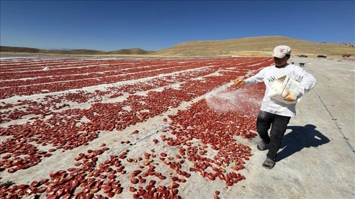 Kuruması için güneşe bırakılan domatesler, işçiler tarafından tuzlanıyor.