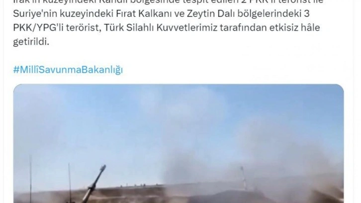 Bakanlığın sosyal medya hesabından yapılan açıklamada, "Mehmetçik, kahramanca ve fedakarca mücadeleye devam ediyor! Irak'ın kuzeyindeki Kandil bölgesinde tespit edilen 2 PKK'lı terörist ile Suriye'nin kuzeyindeki Fırat Kalkanı ve Zeytin Dalı bölgelerindeki 3 PKK/YPG'li terörist, Türk Silahlı Kuvvetlerimiz tarafından etkisiz hale getirildi" denildi.