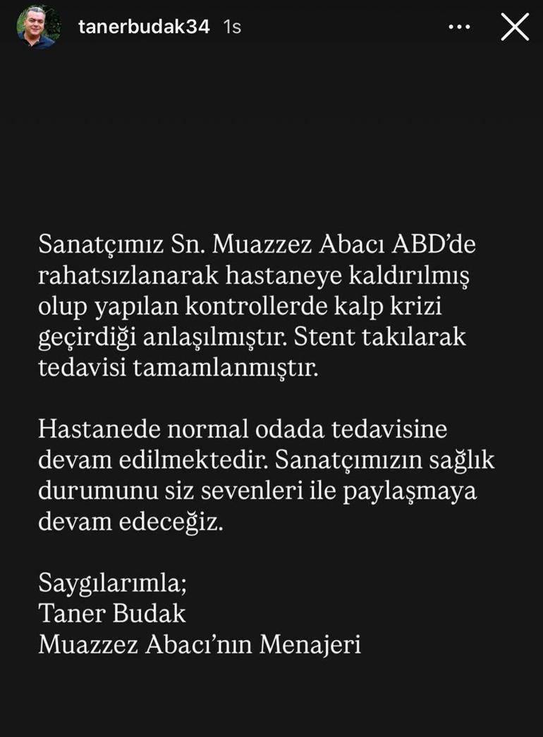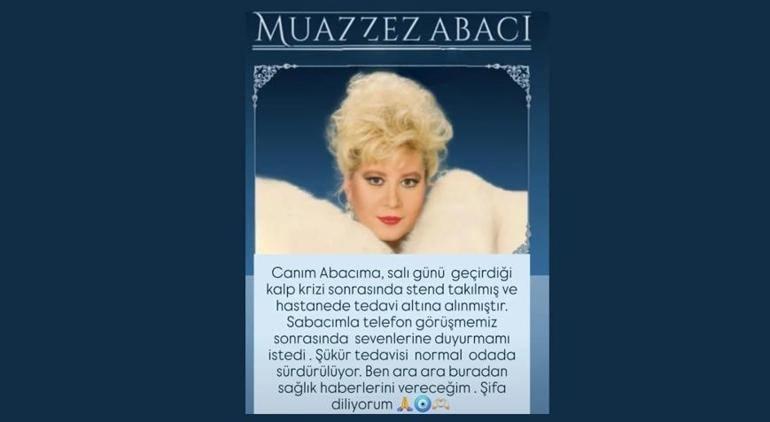 ''Sanatçımız Sn. Muazzez Abacı ABD'de rahatsızlanarak hastaneye kaldırılmış olup yapılan kontrollerde kalp krizi geçirdiği anlaşılmıştır. Stent takılarak tedavisi tamamlanmıştır. Hastanede normal odada tedavisine devam edilmektedir. Sanatçımızın sağlık durumunu siz sevenleri ile paylaşmaya devam edeceğiz."