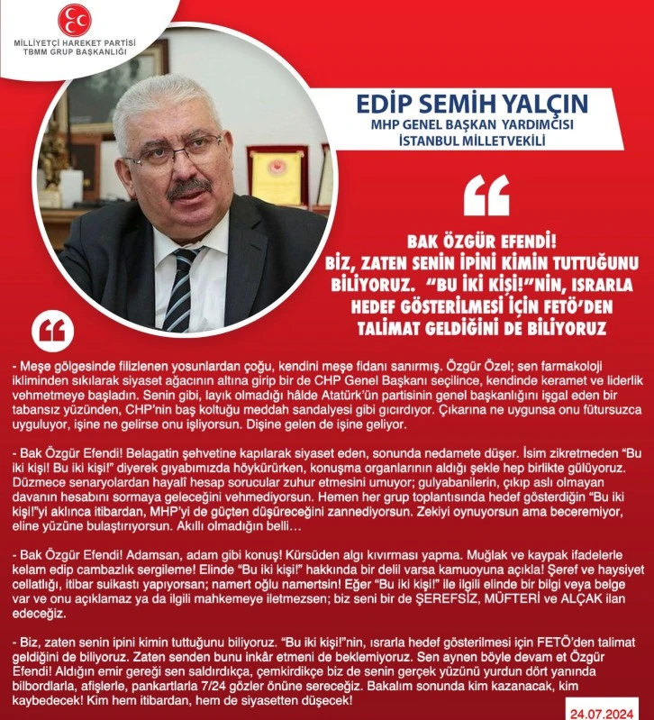 Bak Özgür Efendi! Adamsan, adam gibi konuş! Kürsüden algı kıvırması yapma. Muğlak ve kaypak ifadelerle kelam edip cambazlık sergileme! Elinde "Bu iki kişi!” hakkında bir delil varsa kamuoyuna açıkla! Şeref ve haysiyet cellatlığı, itibar suikastı yapıyorsan; namert oğlu namertsin! Eğer "Bu iki kişi!” ile ilgili elinde bir bilgi veya belge var ve onu açıklamaz ya da ilgili mahkemeye iletmezsen; biz seni bir de ŞEREFSİZ, MÜFTERİ ve ALÇAK ilan edeceğiz.