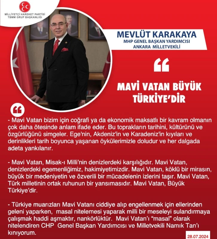 - Türkiye muarızları Mavi Vatanı ciddiye alıp engellenmek için ellerinden geleni yaparken, masal nitelemesi yaparak milli bir meseleyi sulandırmaya çalışmak haddi aşmaktır, nankörlüktür. Mavi Vatan'ı "masal” olarak nitelendiren CHP Genel Başkan Yardımcısı ve Milletvekili Namık Tan'ı kınıyorum.