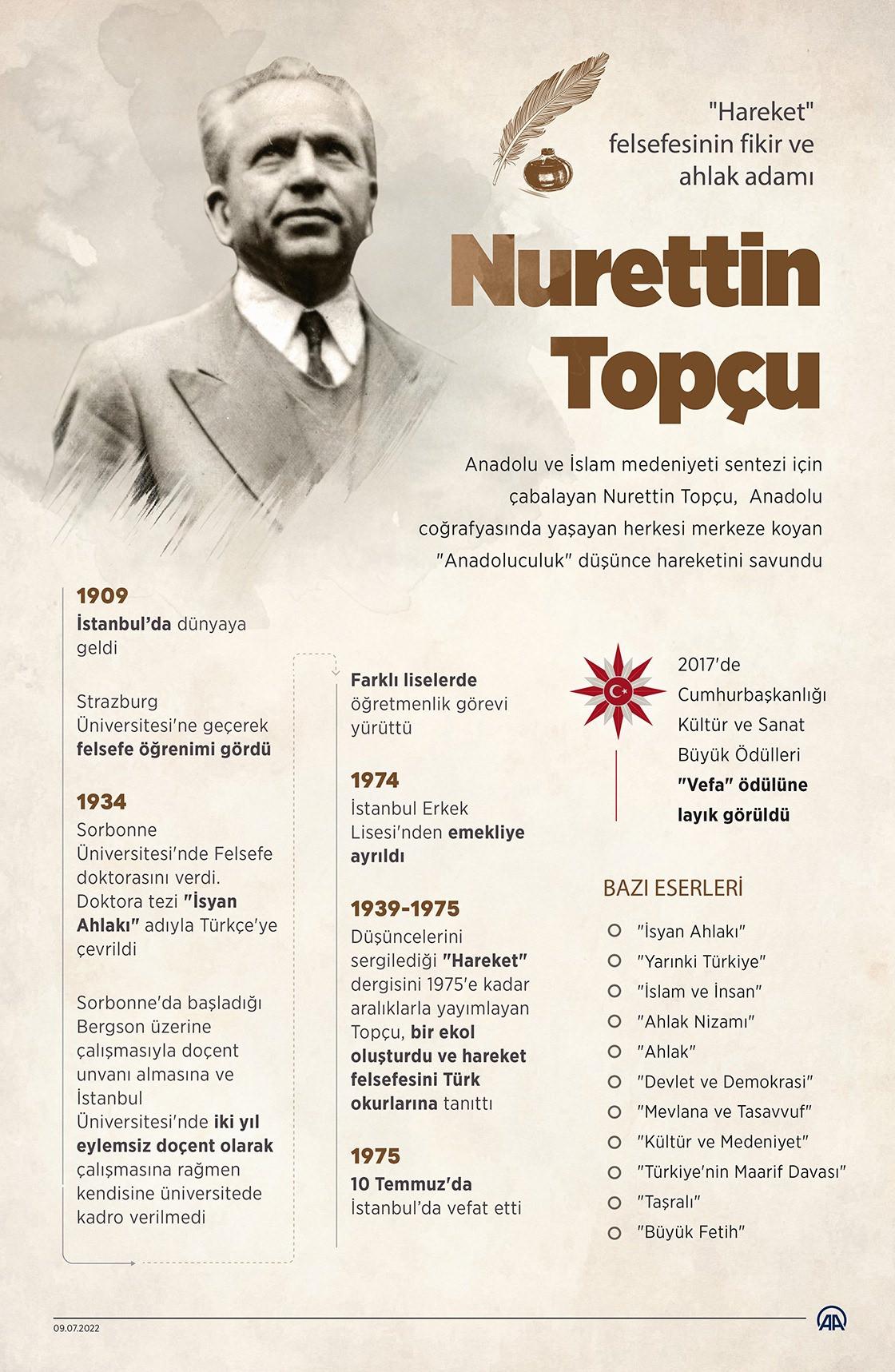 Akıl ve gönül insanı olan Nurettin Topçu, bir duruşun, mücadelenin, fedakârlığın ve cesaretin adıdır. Topçu sadece sorunları dile getirmemiş, çözüm önerileri de sunmuştur. Bu çerçevede çıkış yolu olarak ne Doğu'yu ne de Batı'yı rehber olarak görmüştür. Bin yıllık tarih içinde yoğrulan Anadolu'da "ahlaki bir nizam" kurmak istemiştir. Topçu'nun düşünce dünyasında ahlak, realiteye boyun eğme değil, hak ve hakikat uğruna ona isyandır. Onun için tezine “İsyan Ahlakı” ismini vermiştir. Ahlak eğitimi olmadan vicdan eğitiminin olamayacağını belirtir. Onun sunduğu sistem, insan ve ahlak merkezli bir dünya görüşüdür.