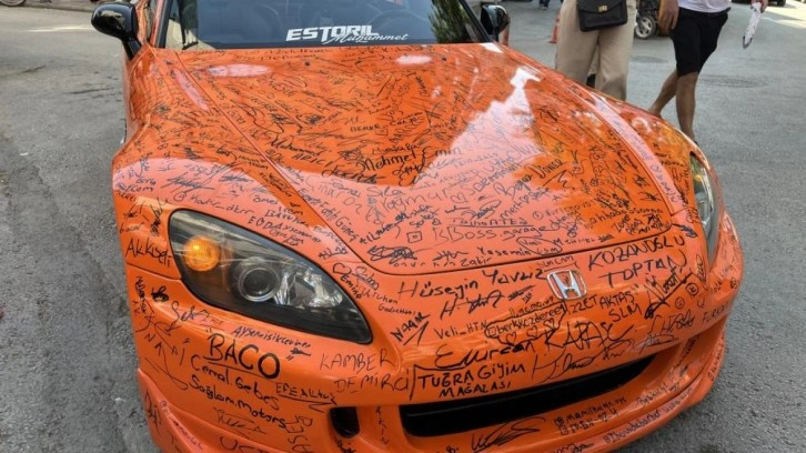 Konya'da yaşayan 25 yaşındaki esnaf Muhammet Çetin, otomobiline kendi çevresiyle birlikte imza atmaya başladı. Çetin'in iş yerinin karşısında duran turuncu renk kaplamalı Honda S2000 Cabrio otomobili ilgi odağı olurken, görenler araca imza atmadan geçmiyor.
