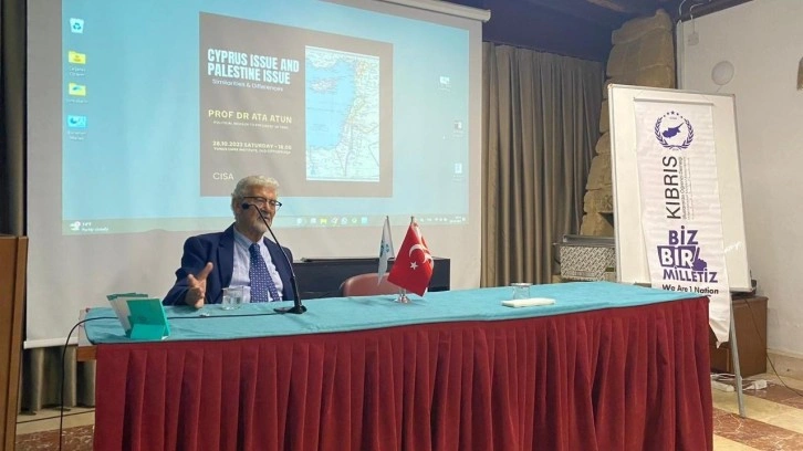 KKTC Uluslararası Öğrenci Birliği tarafından Yunus Emre Enstitüsünün Lefkoşa Merkezindeki Konferans Salonunda Cumartesi akşamı, Prof. Dr. Ata Atun, KKTC'de eğitimlerine devam eden Uluslararası Öğrencilerimize yönelik, özellikle içeriğinde Filistin ile Kıbrıs adasının tarihlerinin ve Kıbrıs Türklerinin varoluş mücadelesinin de yer aldığı, "Kıbrıs ve Filistin, Benzerlikleri ve Ayrılıkları" başlıklı bir konferans verdi.