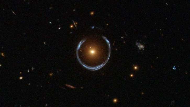 Galaksi, o kadar büyük bir kütleçekim gücüne sahip ki, arkasındaki başka bir galaksiden gelen ışığı dev bir at nalı şeklinde Einstein halkasına dönüştürüyor.