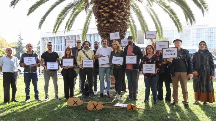İBB'nin Saraçhane'deki başkanlık binasının önünde bir araya gelen sanatçılar, sazlarına yapıştırdıkları siyah bantla çarpı işareti yaptı.