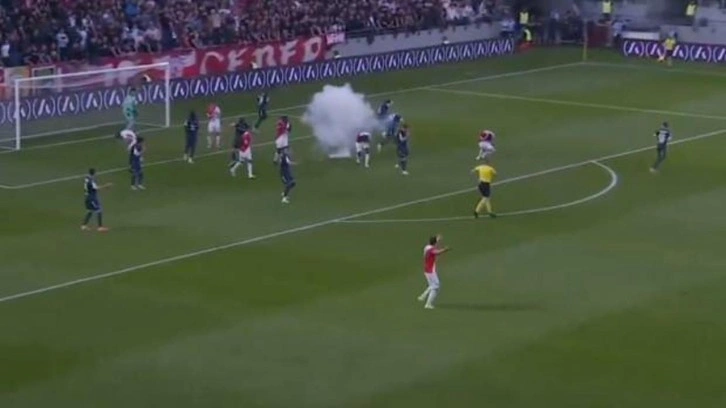 Kale arkası tribününden sahaya patlayıcı madde atılması sonrası ceza sahasında dört futbolcu yere yığıldı.