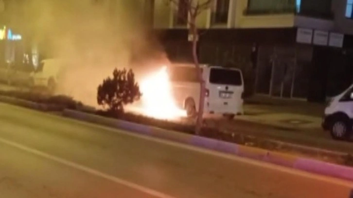 Minibüsün yandığı anlar, çevredekiler tarafından cep telefonu kamerasıyla kaydedildi.