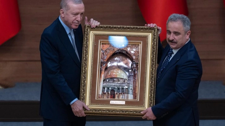 Türkiye Basın Federasyonu Genel Başkanı Sinan Burhan, Cumhurbaşkanı Erdoğan'a Mescid-i Aksa'nın tablosunu hediye etti.