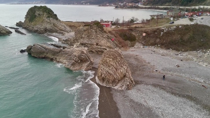Kentte sert esen poyraz ve gelgite bağlı olarak bazı dönemlerde görülen deniz çekilmesi dolasıyla Türkeli ilçesindeki Güllüsu Kayalıkları'nın çevresi karaya dönüştü.