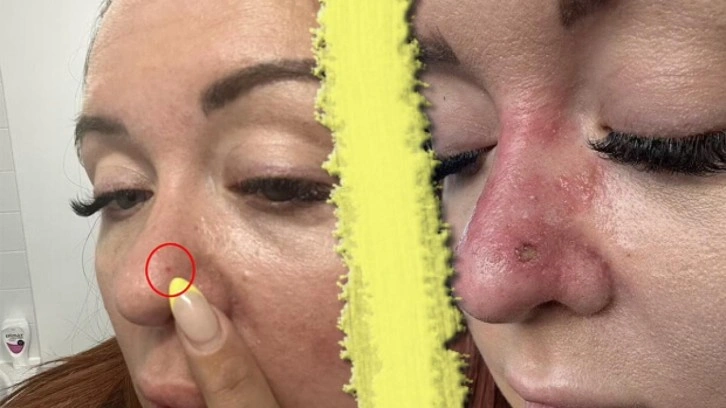 35 yaşındaki Kerry-Ann Buckell, burnunun kenarındaki küçük şişliği sivilce sandı ve sıkarak geçirmek istedi. Ancak leke her seferinde hiç gitmemiş gibi geri geldi.