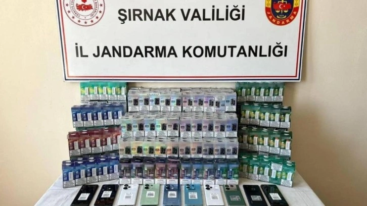Şırnak İl Jandarma Komutanlığı Kaçakçılık ve Organize Suçlarla Mücadele Şube Müdürlüğünce Silopi, Cizre ve İdil ilçelerinde yapılan operasyonlarda, 6 adet cep telefonu, 3 adet uyuşturucu kullanma aparatı, 6 bin 367 adet bandrolsüz sigara, 347 adet elektronik sigara, 184 adet kaynak makinesi, 44 adet ayakkabı, 22 adet elektronik eşya, 267 inşaat malzemesi, 660 adet anahtar takımı, 110 adet muhtelif ev-büro eşyası, 3 bin 174 adet el aletleri, 288 adet kozmetik malzemesi, 780 adet mutfak eşyası, 184 adet kaynak makinesi, 4 adet sikke, 1 adet yüzük ele geçirildi.