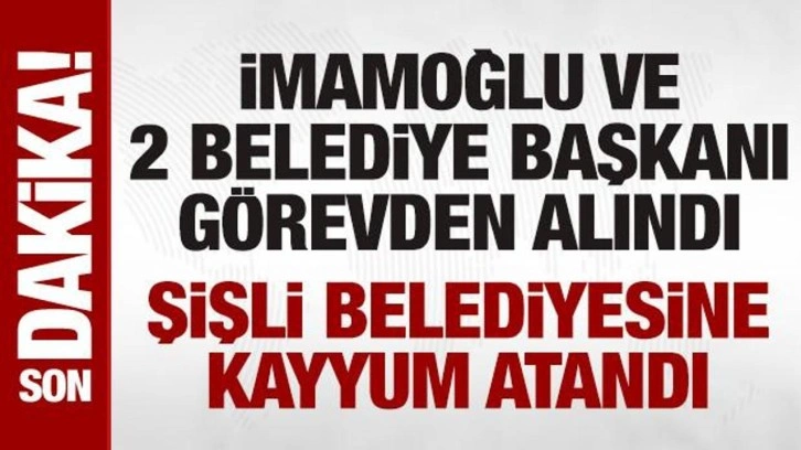 SON DAKİKA HABERLERİ... İBB Başkanı Ekrem İmamoğlu ile Şişli ve Beylikdüzü Belediye Başkanları, İçişleri Bakanlığınca görevden uzaklaştırıldı. Öte yandan Şişli Belediyesine kayyum atandı.