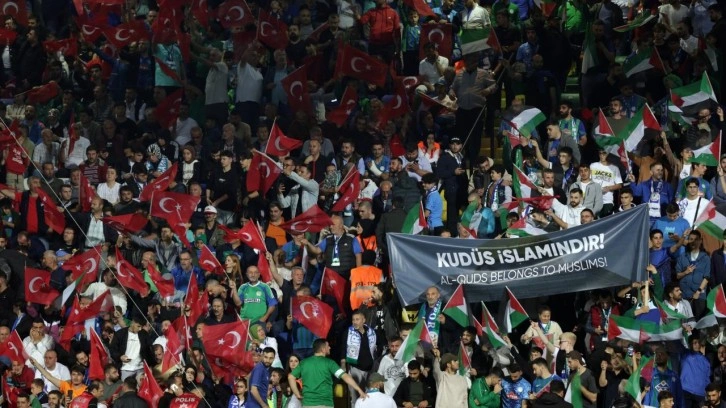 Takımlarını desteklemek için tribündeki yerini alan binlerce Çaykur Rizespor taraftarı, Filistin bayrağı ve atkıları açarak Filistin lehine sloganlar attı, dua etti.