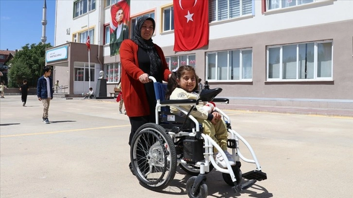 Satı Gedik, 5 çocuğundan en küçüğü olan Ayşenur'u eğitiminden mahrum kalmaması, arkadaşlarıyla sosyalleşebilmesi için anaokulundan itibaren akülü sandalyeyle her gün yaklaşık 2 kilometre mesafedeki okula getirip götürüyor.