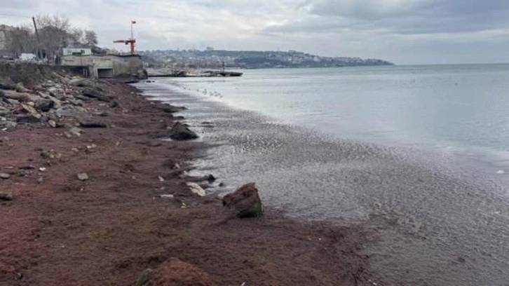 Rüzgar nedeniyle denizin dibinden kopan kırmızı yosunlar, Tekirdağ sahilinin bir kısmını kapladı.